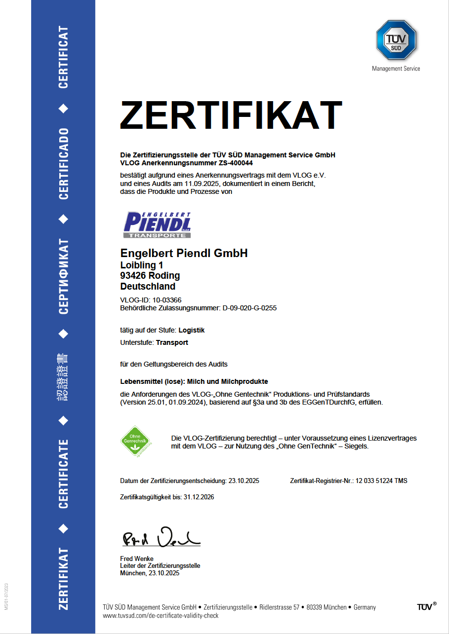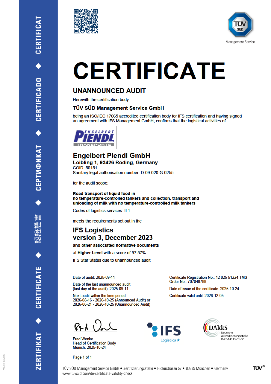 Careful handling of our customers’ dairy products lies at the heart of what we do. That is why our company has already been certified to the IFS Logistics Standard since 2015. This standard requires careful quality management in handling foodstuffs.